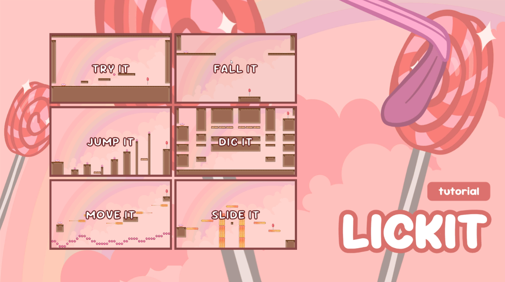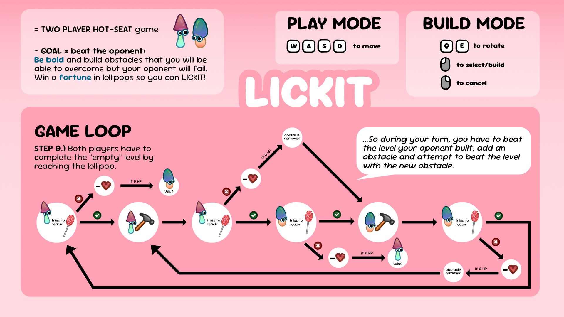 LICKIT is a two-player PvP hot-seat platformer, where you have to be bold and build obstacles for both of you to overcome. The winner gets a fortune in lollipops!