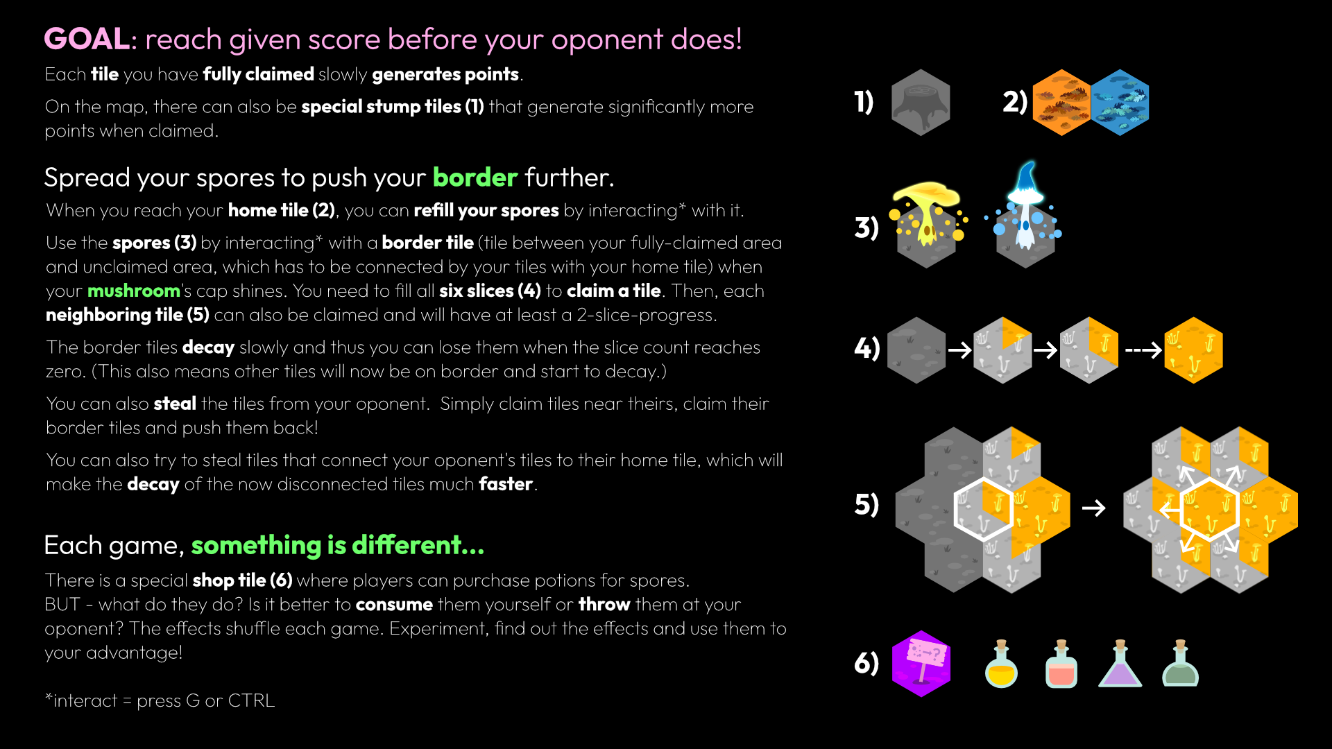 Spory is a couch-competitive for 2 players, where you try to spread your mushroom borders and stop your oponent from spreading theirs.